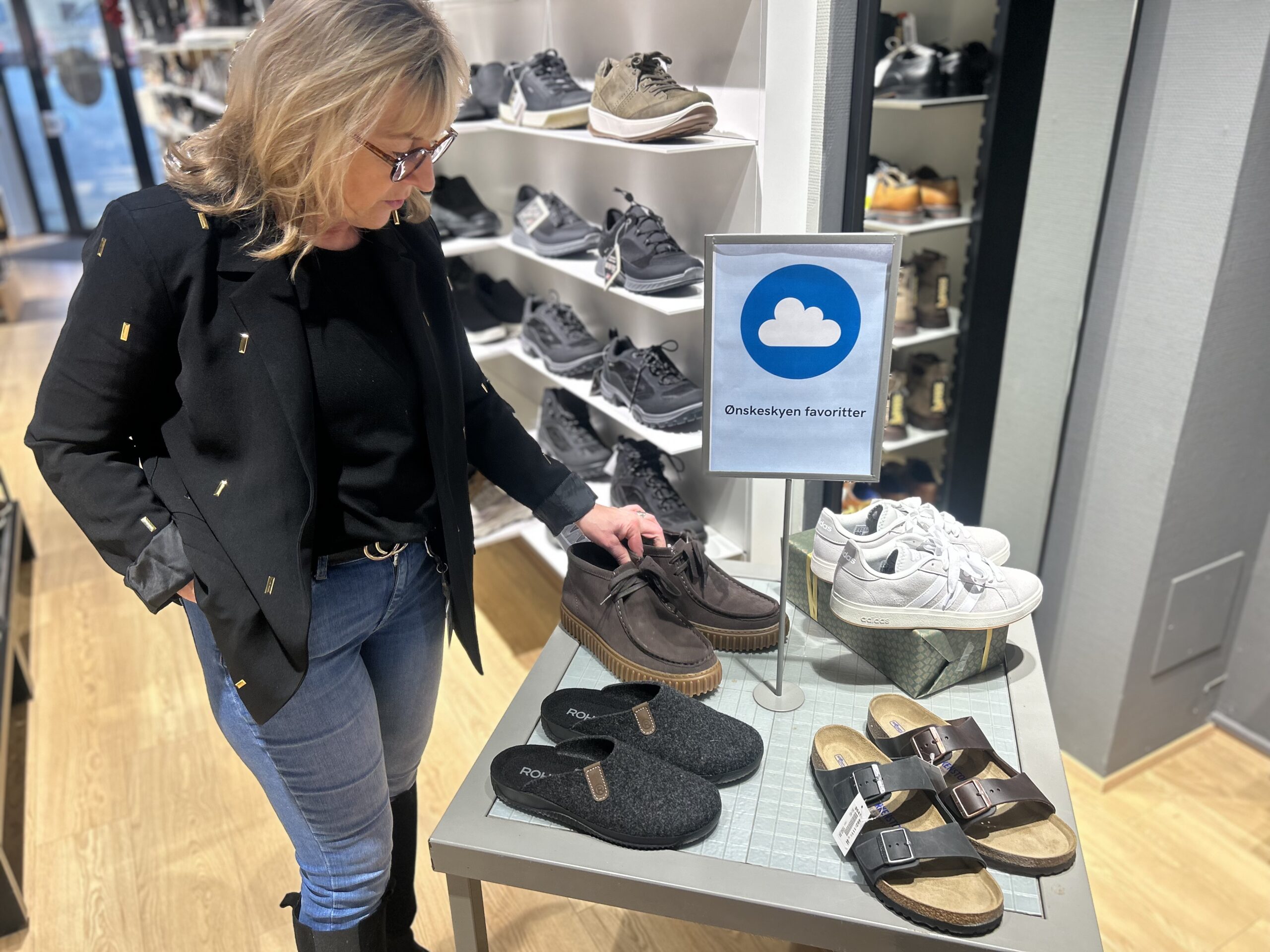 For at gøre det nemmere for kunderne i december har Skoringen samlet årets mest efterspurgte varer ét sted i butikken. »Det er simpelthen favoritterne, der står på ét bord,« forklarer Lone og peger på det, de kalder ønskeskyen. Her står de modeller, som kunderne oftest spørger efter – opdelt i herre- og damefavoritter. »Hvis man mangler en julegave, så står det lige der. Så er det bare at gå ind ad døren.«