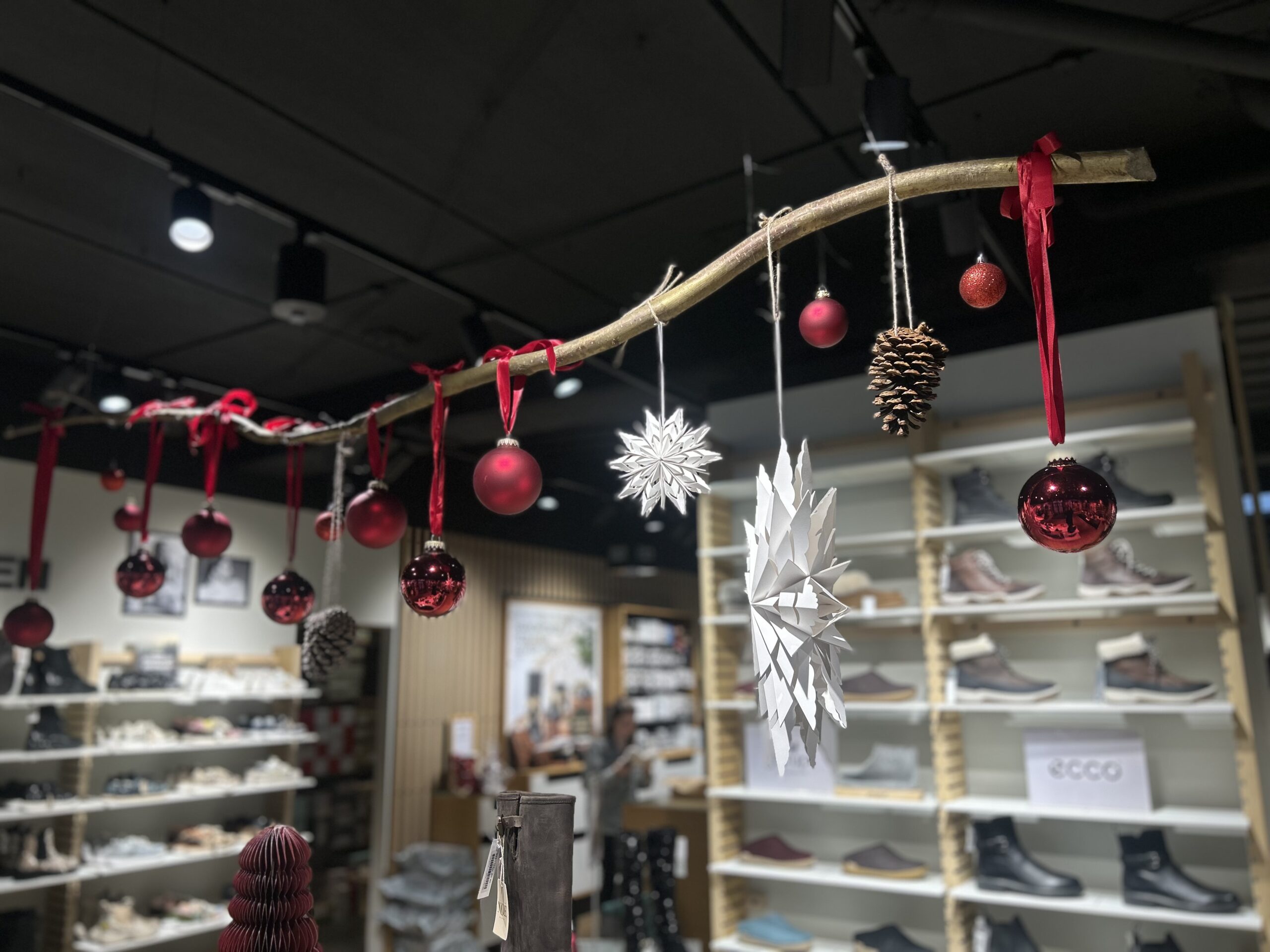»Ja, vi pynter op hvert år,« fortæller Lone. »Og en af traditionerne herinde er, at vi altid skal have den gren op over bordet.« Grenen hænger samme sted hvert år og er blevet et fast holdepunkt i butikkens juleudtryk. »Alt det andet finder vi lidt på fra år til år, men den gren skal op. Den har hængt der hvert år i de fem år, jeg har været her.« Det er små traditioner som den, der giver butikken genkendelighed – også for de kunder, der kommer igen år efter år.